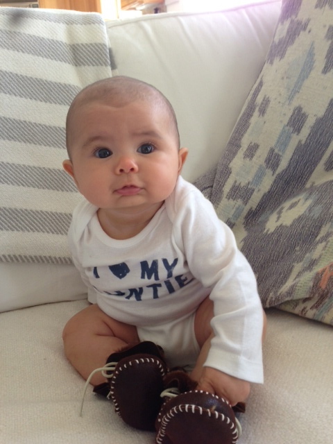 A good friend gave us a darling pair of faux-fur booties when I was pregnant with Ellie, and she's finally big enough to wear 'em...and she finds them quite interesting!